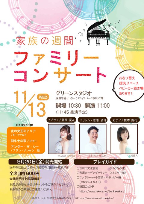 【明日公演】*当日券販売ございます*家族の週間ファミリーコンサート〈時間〉開演11:00(開場10:30)〈会場〉グリーンスタジオ(メディアパーク市川2階)皆さまのお越しをお待ちしております!詳細はこ..