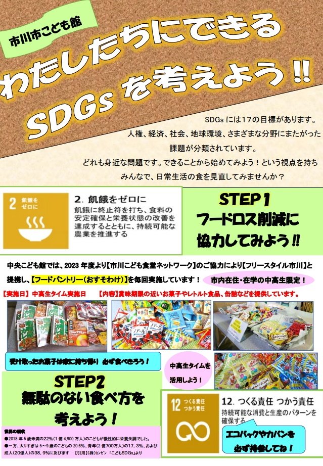 中央こども館では、2023年度より、「中高生タイム」実施日に、市川こども食堂ネットワークの協力のもと、フリースタイル市川(いちかわフードバンクbyフリスタ)と連携して、食品のおすそわけ=フードパントリ..