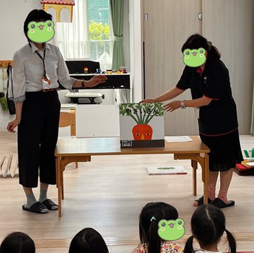 今日は、市の中央図書館の方に来園していただき、読み聞かせをしていただきました絵本あり、手遊びあり、パネルシアターありと楽しい時間を過ごす事が出来ました