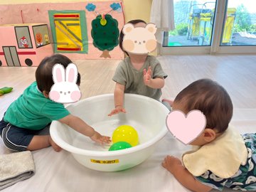 0歳児つくし組です夏の遊びとして泡遊び、水風船遊びをしました!泡遊びでは泡の中に手を入れ、「これはなに?!」と不思議な表情のこどもたち!手でにぎにぎしてみたり、保育者の真似をして混ぜようとする姿も見ら..