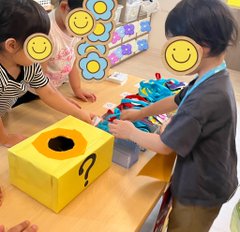 幼児クラス夏祭りたこ焼き屋さん、金魚すくい、くじ引き、お面屋さんを開催しました。5歳児クラスが話し合って決めて準備をしてきた屋台をみんなで楽しみました!ヨーヨー釣りやスイカ割りも行っていますおやつはポ..