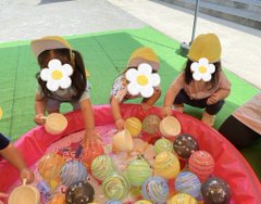 乳児クラス夏祭りの様子夏祭りの雰囲気に朝からワクワクのこどもたち!ヨーヨーすくいをしたり、バギーおみこしをして交流を楽しみました各クラスでは0歳児は氷遊び、風船ベッド。1歳児は流し春雨。2歳児はもぐら..
