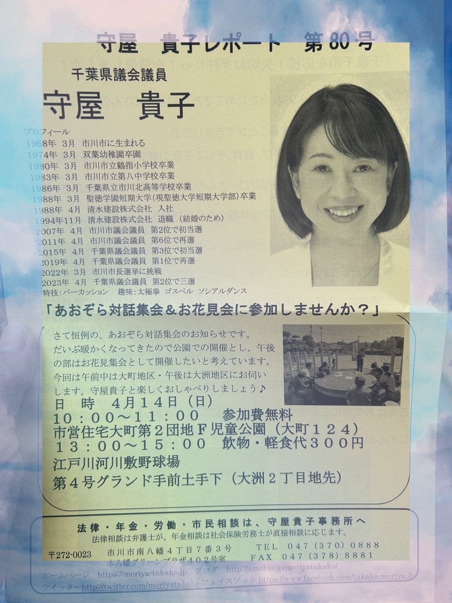 4/14(日)あおぞら対話集会&お花見会10:00〜11:00市営住宅大町第二団地F児童公園(大町124)参加費無料13:00〜15:00江戸川河川敷野球場第4号グランド手前土手下(大洲2丁目..