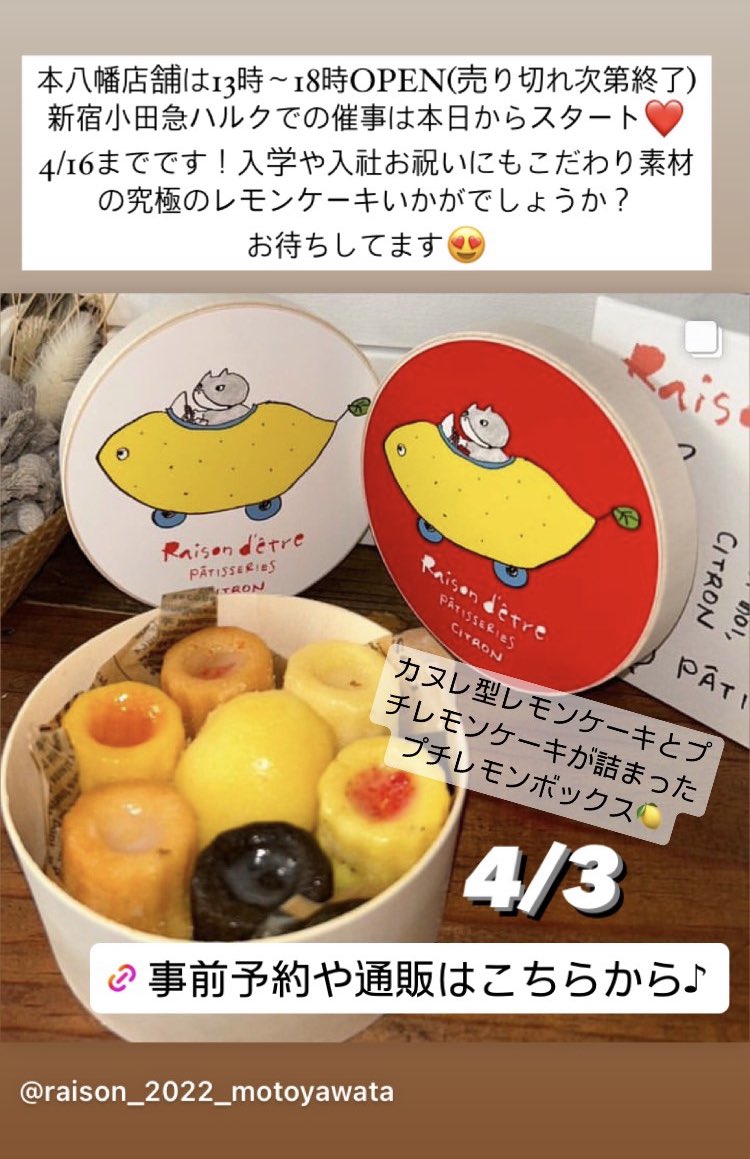 4/3 本八幡店舗は13時〜18時 OPEN(売り切れ次第終了) 新宿小田急ハルクでの催事スタート❤️ 4/16までです! 入学や入社お祝いにもいかがでしょうか? 自分へのご褒美スイーツとしても😊♪ お待ちしております🍋