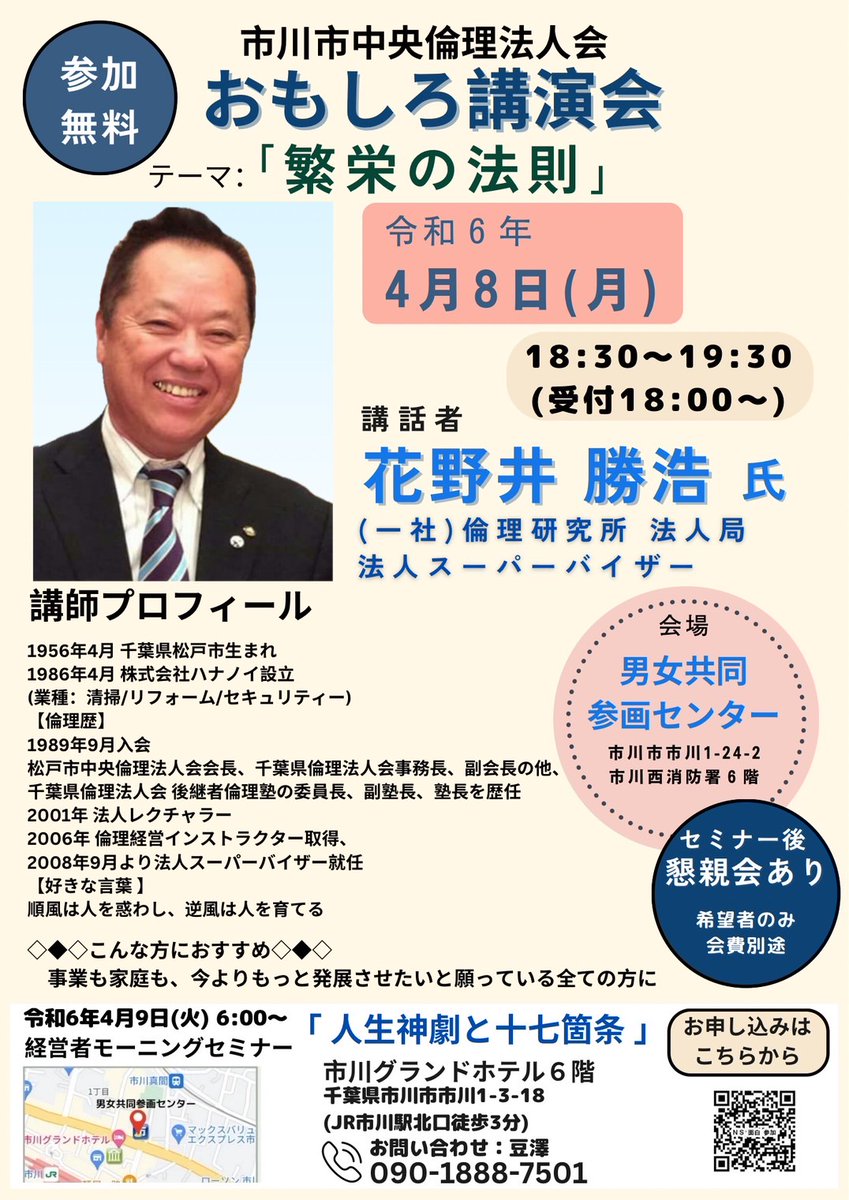 4/8おもしろ講演会開催!「繁栄の法則」講師:花野井勝浩法人スーパーバイザー(株)ハナノイ代表取締役日時:4月8日(月)18時30分から会場:男女共同参画センター6階会費:無料未会員の方にぜひお聴きい..
