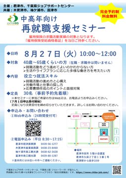 【あなたの街へ出張します!中高年向け再就職支援セミナー】概ね40歳~65歳の方を対象に、就職活動に役立つセミナーや生活・就労などの個別相談を実施します!今回の会場は君津市内です。ぜひご参加ください。開..