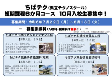 【ちばテク入校生募集中】#ちばテク(#千葉県立テクノスクール)では、就職や転職を希望する方を対象に、様々なジャンルの職業訓練などの就職支援を行っています。現在、短期課程(6か月コース)の10月からの入..