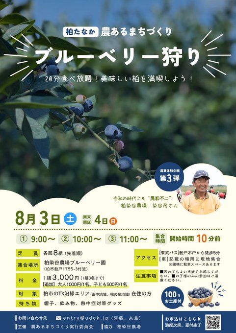 柏たなか農あるまちづくり「ブルーベリー狩り」日時:8月3日(土)①9:00~②10:00~③11:00~定員:各回8組(先着)集合場所:柏染谷農場ブルーベリー園料金:1組3,000円(1組3名まで)【..