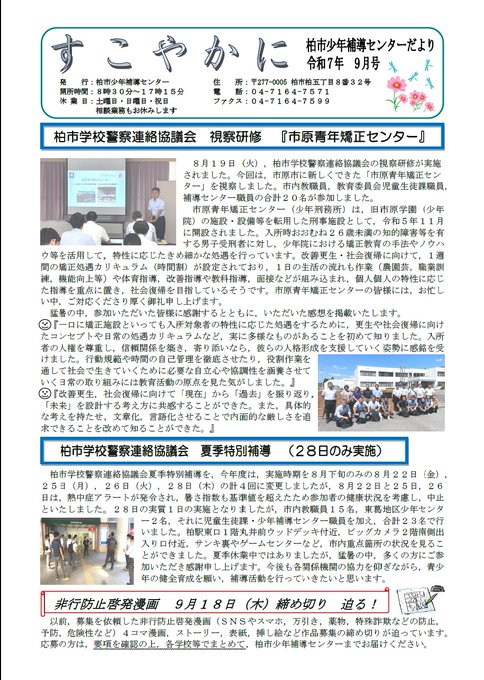 柏市少年補導センターだより「すこやかに」9月号を掲載します。ご覧ください。#柏市役所