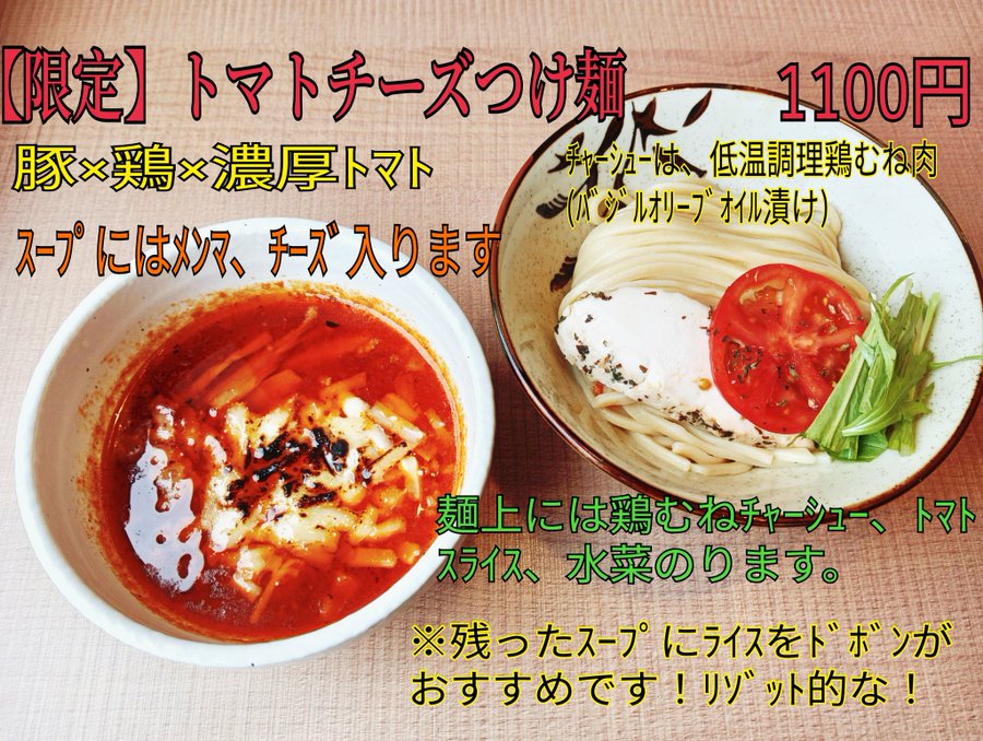 おはようございます!9/7(日)本日も通常営業です本日の限定は「トマトチーズつけ麺」ですライスと一緒に食べても相性が良いのでぜひ!本日もよろしくお願いします!