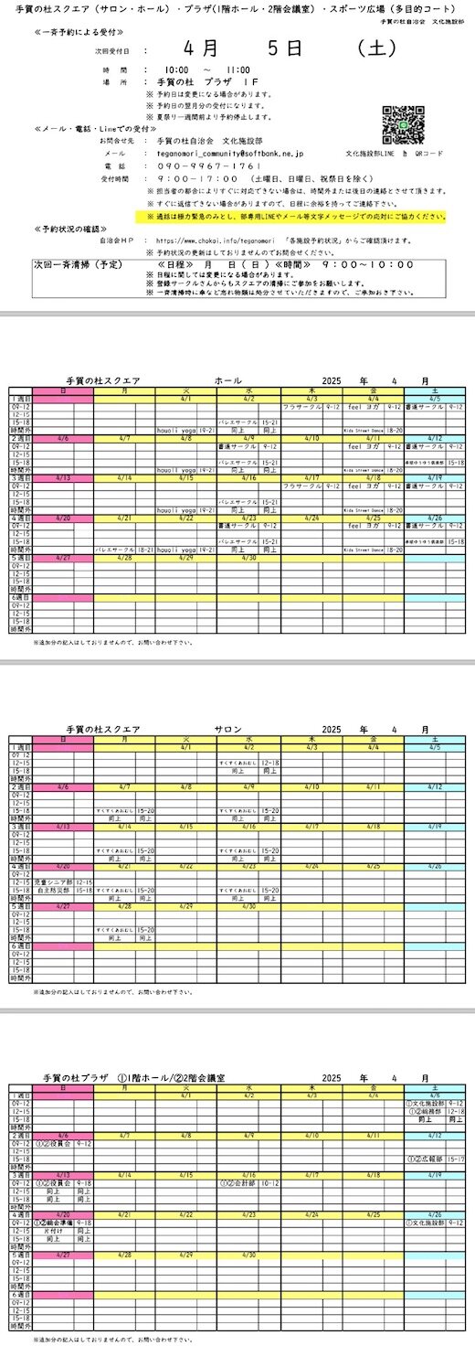拡大版は、下の文字列をクリックしてPDFをダウンロードしてご覧ください。⇒令和7年手賀の杜自治会施設4月分の予約(PDF)