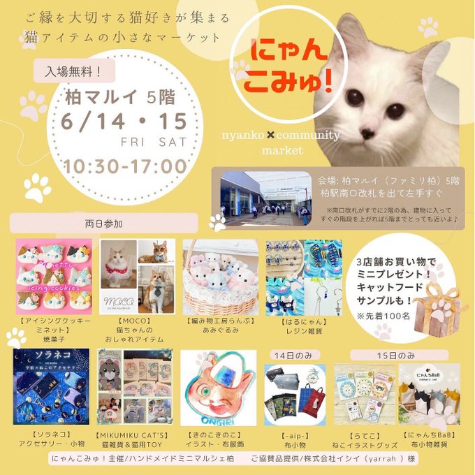 ハンドメイドミニマルシェ柏たーくさんのご来場ありがとうございました次は6/14.15金土、柏駅すぐのマルイ五階ミニ猫イベントだぁにゃんこみゅ!初開催【5階】なので間違えないようにねドキドキです!!梅雨..