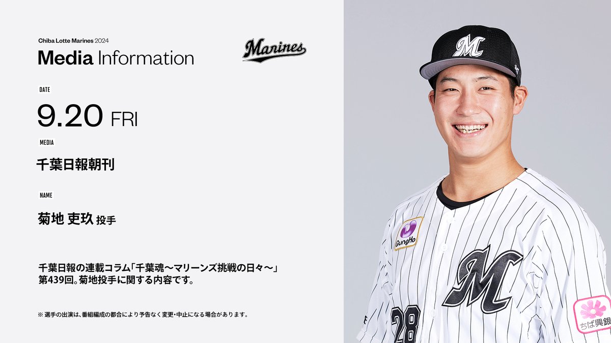 /明日のメディア情報!\■9/20(金)千葉日報朝刊球団広報による千葉日報の連載コラム「千葉魂~マリーンズ挑戦の日々~」第439回。#菊地吏玖投手に関する内容です。▼https://marines.c..