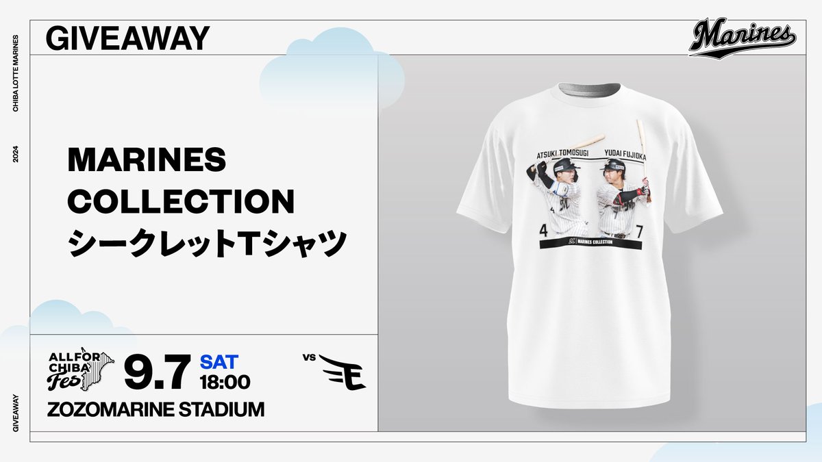 9/7(土)イーグルス戦で「MARINESCOLLECTIONシークレットTシャツ」付きチケットを販売中!デザインは全部で10種類。開けるまでどのデザインが当たるか分からないシークレット方式のTシャツ..