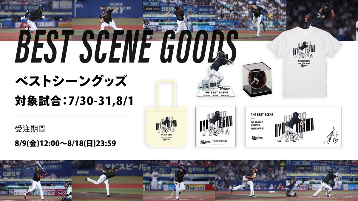 マリーンズオンラインストア限定で8/9(金)から、ベストシーングッズの受注販売を開始します。7/30(火)ライオンズ戦でサヨナラバントヒットを決めた#小川龍成選手や、7/31(水)ライオンズ戦で1試合..