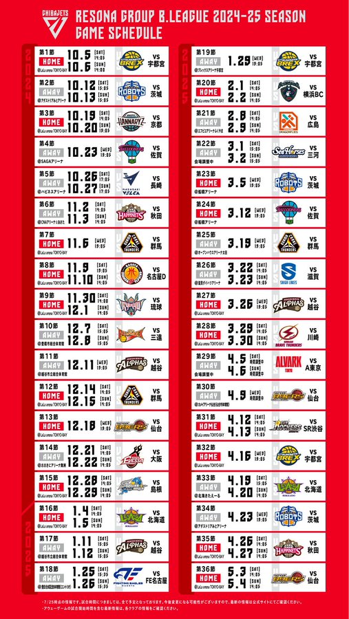 【お知らせ】このたび、りそなグループB.LEAGUE2024-25シーズンの全試合日程と、前半戦(第16節)までの会場・試合開始予定時刻が決定しましたのでお知らせいたします。後半戦の会場・試合開始予定..