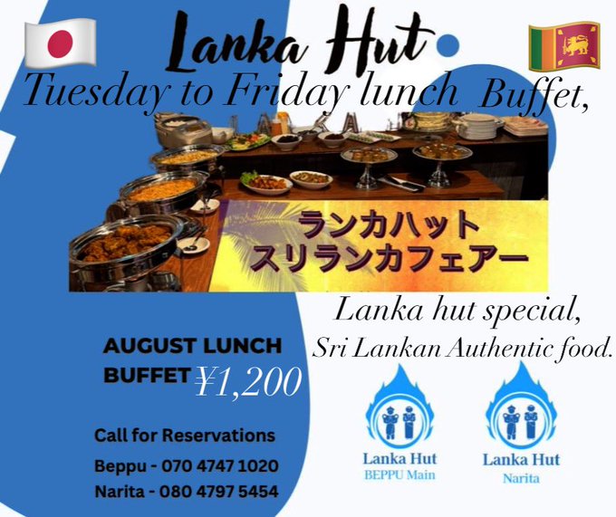 LankanhutSriLankanrestaurantNarita,TuesdaytoFridayLunchBuffet,11.00am.To3.30pm.¥1,200