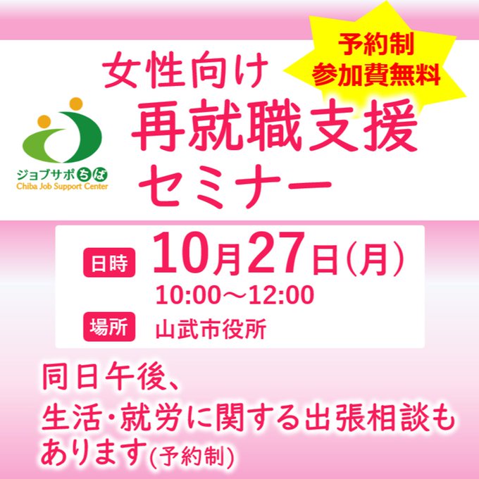 あなたの街へ出張します!【女性向け再就職支援セミナー】就職活動中の女性を対象に、就職活動に役立つセミナーや生活・就労などの個別相談を実施します!今回の会場は山武市内です。ぜひご参加ください。開催日:1..