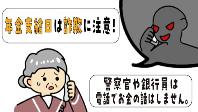 【STOP!電話de詐欺!】年金が支給される偶数月は、#電話de詐欺の被害が増加する傾向にあります。最近では+からはじまる国際電話番号による詐欺や警察官をかたる詐欺被害が増えています。警察庁のホームペ..