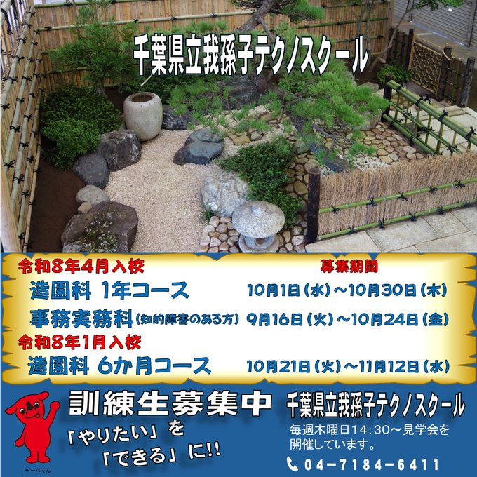 【我孫子テクノスクールの入校生募集中!】我孫子テクノスクールでは、造園科1年コースと事務実務科の令和8年4月入校生を募集してます。また10/21からは、造園科6ヵ月コースの令和8年1月入校生の募集が始..