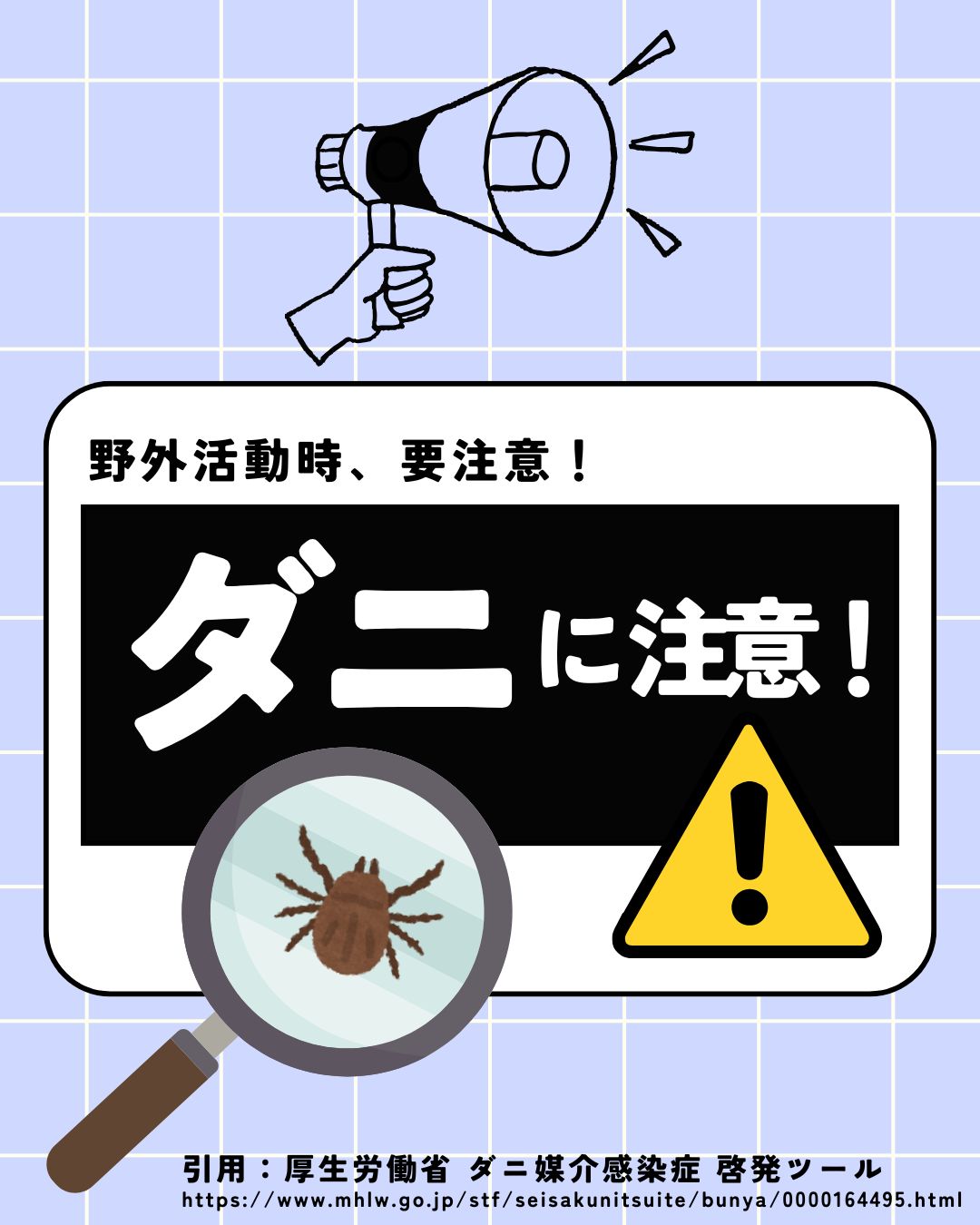 ⚠️ダニに注意!⚠️ダニ媒介感染症とは…病原体を保有するダニに刺されることによって起こる感染症のこと。野外作業や農作業、レジャー等、ダニが生息する野外で活動する際には、注意しましょう!引用:ダニ媒介感..
