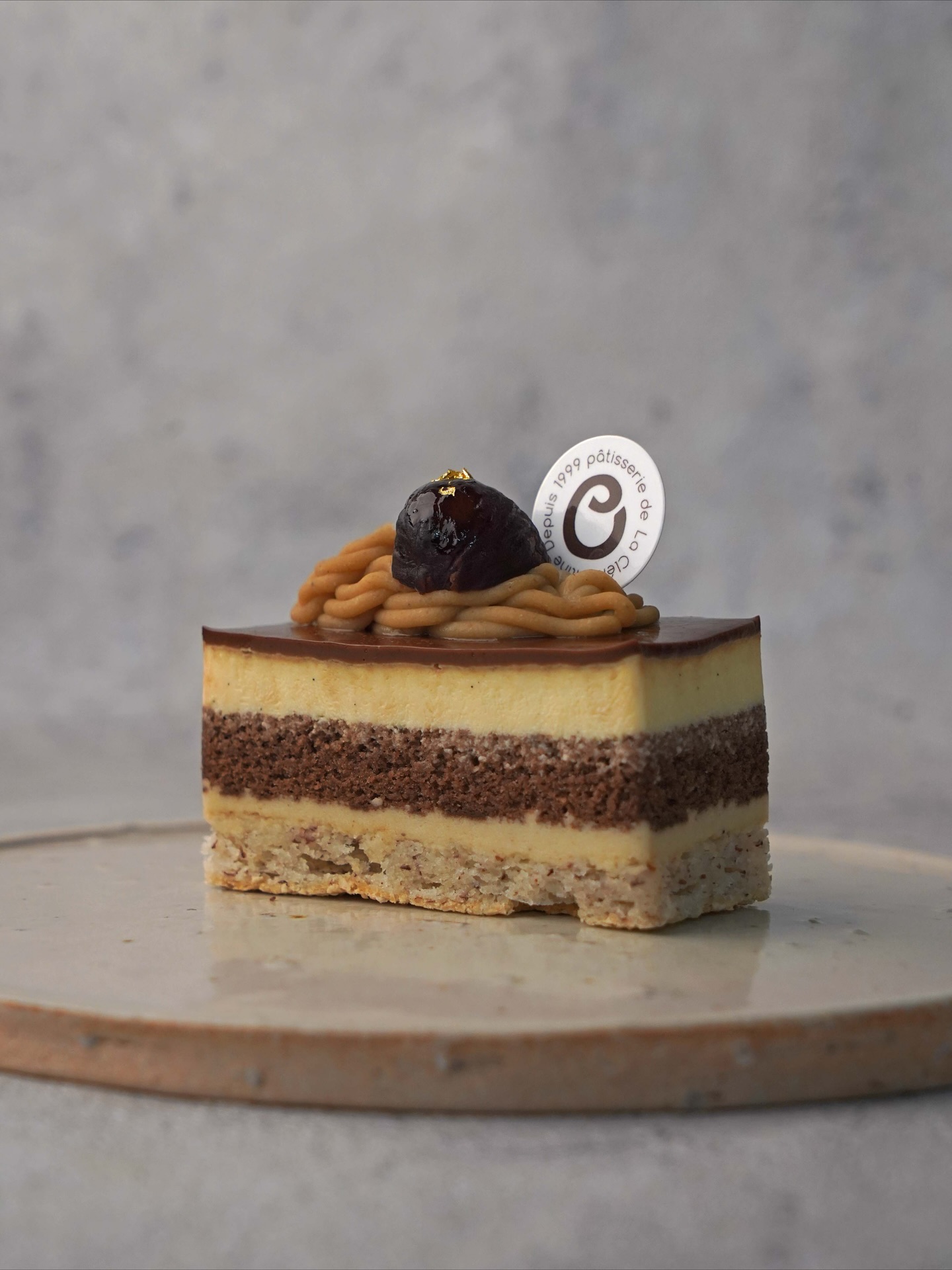 【季節限定商品のご紹介】『栗とバニラ』しっとりとしたダックワーズに、マロンのババロワーズとビスキュイショコラ、香り豊かなバニラムースを重ねました。仕上げには、イタリア産マロンペーストと艶やかな栗。秋の..