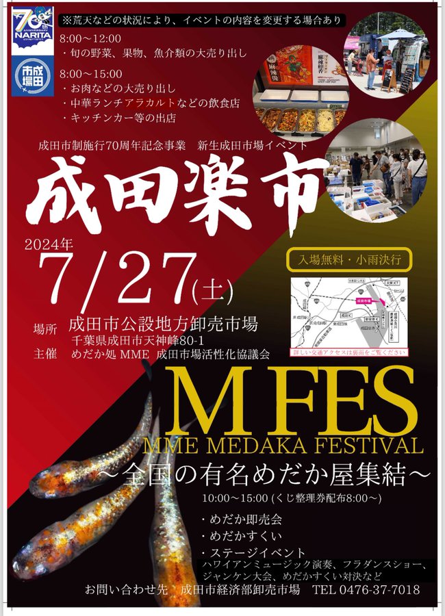 7月27日土曜日は成田市場の楽市今回はメダカ屋さんカーニバルフラダンスフェスティバルなどいつもと違う催し物勿論お買い得品も盛り沢山٩(^‿^)۶いつものやまにゃんマグロブツもございます今回は110kの..