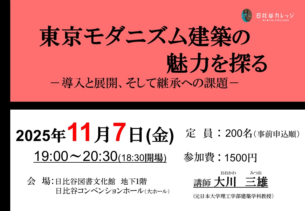 \#日比谷カレッジのお知らせ/#モダニズム建築の記録と保存に取り組んできた#DOCOMOMOJapanの活動を紹介します。#モダニズム建築が日本に定着した過程を整理し魅力を読み解き、現状と課題について..