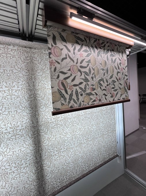 先日ニチベイの展示会でした。 前面ウィリアム・モリスのフルーツと後ろ面エイコーンのロールスクリーン。 お値段はややお高めですが(シルバースクリーンより高いらしい)、とても素敵なプリントでした。
