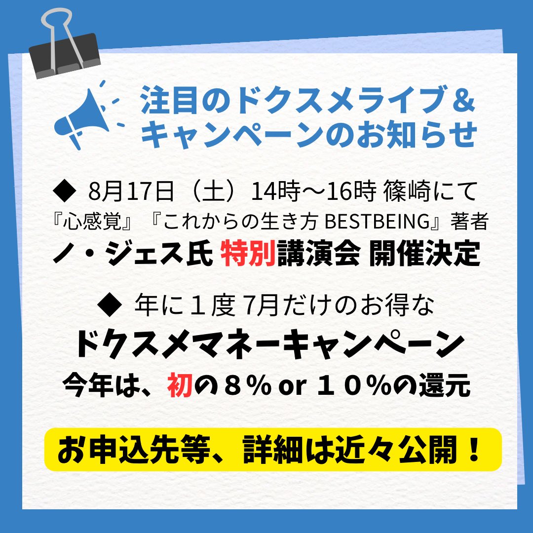 【注目のドクスメライブ&キャンペーンのお知らせ】来月8月になりますが、8月17日土曜日14時から、当店大人気の『心感覚』、『これからの生き方BESTBEING』著者のノ・ジェスさんにお越しいた..