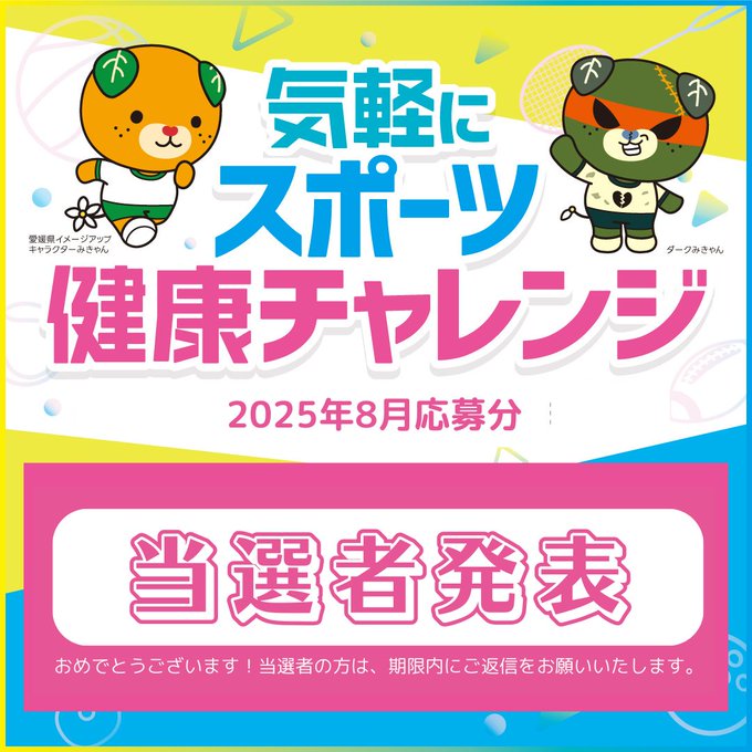 【当選者発表】気軽にスポーツ健康チャレンジ 8月の当選者をHPで公開しております! https://ehime-challengesports.com/challenge2025 ご確認ください。