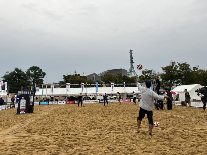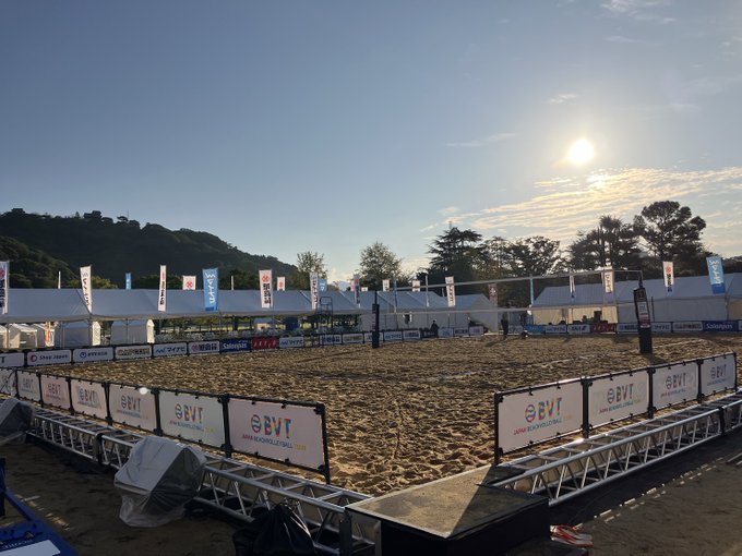 城山公園で開催中のジャパンビーチバレーボールツアー2024第9戦マイナビ松山大会旭食品杯明日は8:00~(一般開場7:45~)トーナメント1回戦会場にはグルメブースも登場\eatでは12:00~熱戦の..