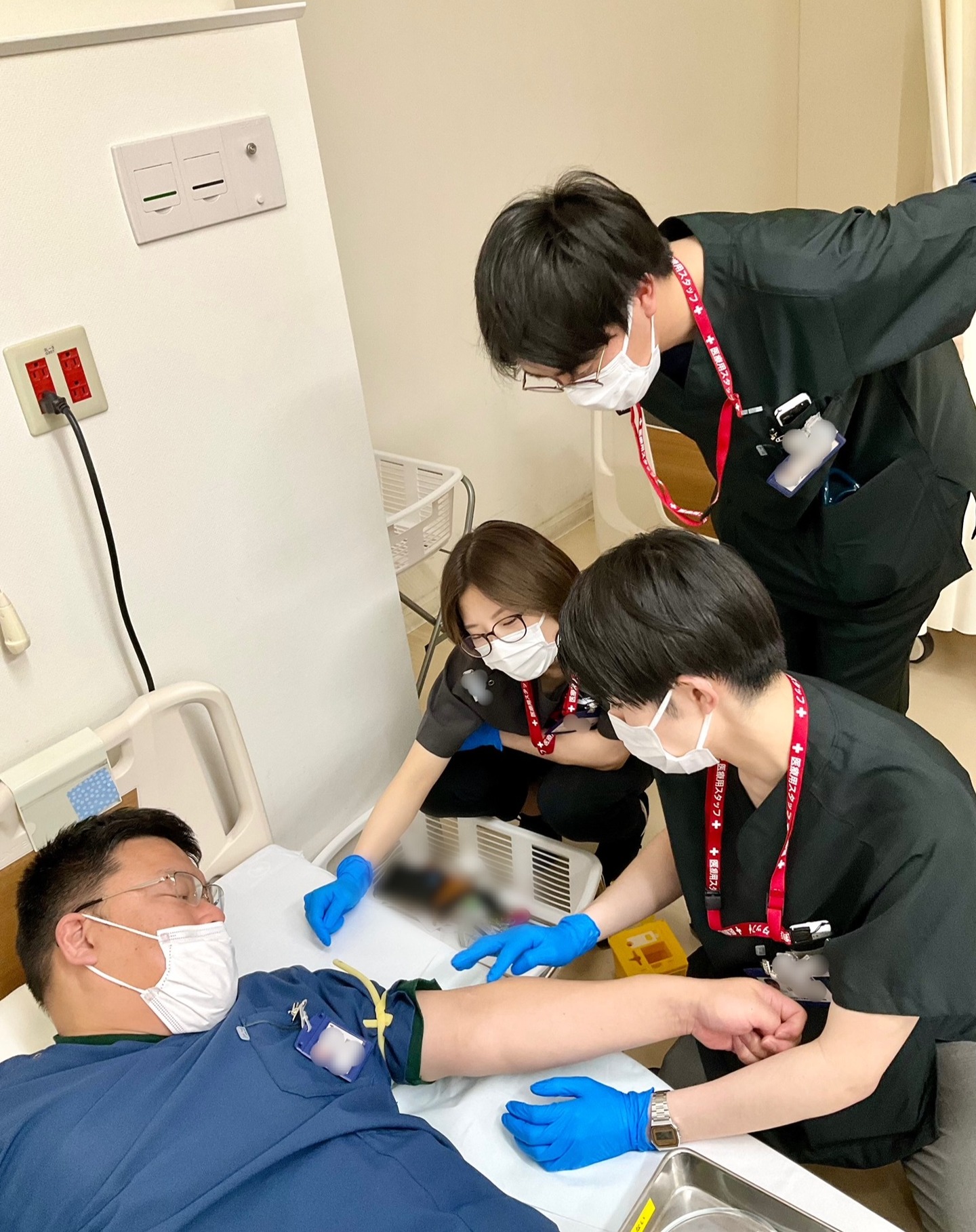 指導医、上級医、Nurseご指導のもとルート確保の練習です。1枚目→指導医の血管を慎重に探しています😅#松..