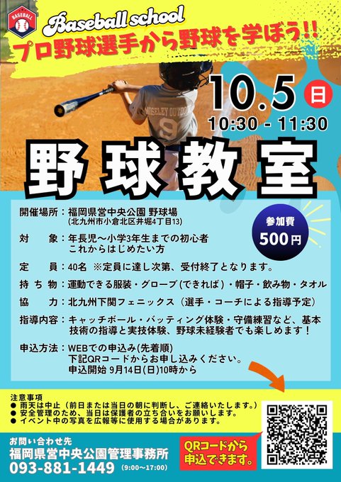 【野球教室開催のお知らせ】 福岡県営中央公園にて初心者・これから野球を始めたい方向けの野球教室を開催します! フェニックスの選手と楽しく野球に触れ合いましょう 10月5日(日)10:30〜11:30 福岡県営中央公園 野球場 年長〜小学3年生対象 参加費500円
