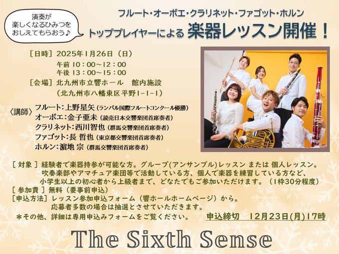 【締切まであと3日/楽器レッスン受講申込】グループ(アンサンブル)レッスン又は個人レッスン。小学生以上の初心者~上級者までどなたでも参加できます!受講無料(1枠30分程度)講師:Fl上野星矢、Ob金子..