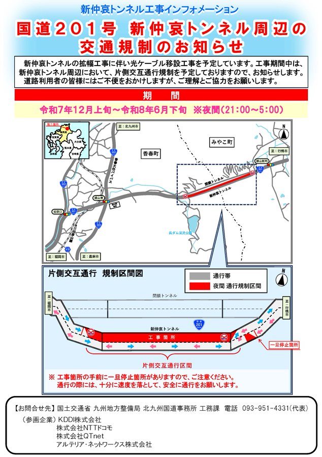 #新仲哀トンネルの拡幅工事に伴い光ケーブル移設工事を予定しています。工事期間中は、新仲哀トンネル周辺において、片側交互#通行規制を予定しておりますので、お知らせします。道路利用者の皆様にはご不便をおか..