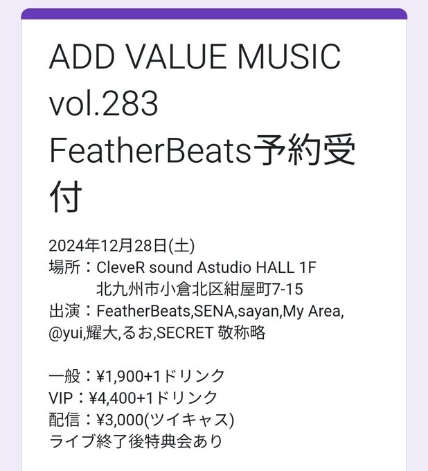 12月28日(土)の予約フォームについて一般枚数のところに1枚VIP枚数のところにVIP1枚と記載してください※VIP席は全体で数が決まっている為確認しご連絡させて頂きます。https://docs...