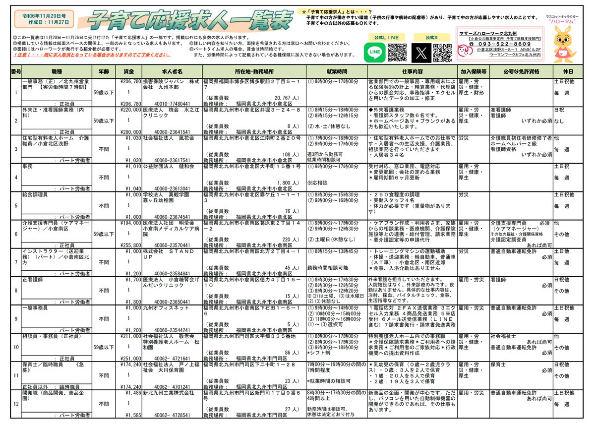 /週刊子育て応援求人(11月29日号)\この一覧表は、11月20日~11月26日に受け付けた求人の一部です求人内容の詳細はお気軽にお問い合わせください093-522-8609次回は12月6日(金)配信..