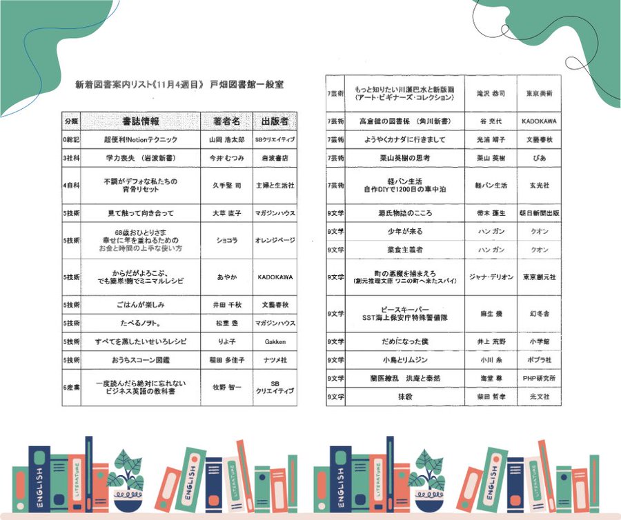 ⊹࣪˖┈┈˖࣪⊹┈┈⊹࣪˖┈┈˖࣪⊹┈┈˖࣪⊹戸畑図書館新着図書のお知らせ⊹࣪˖┈┈˖࣪⊹┈┈⊹࣪˖┈┈˖࣪⊹┈┈˖࣪⊹戸畑図書館11月第4週の新着図書のご案内です#北九州市#戸畑区#戸畑区役所#戸畑..