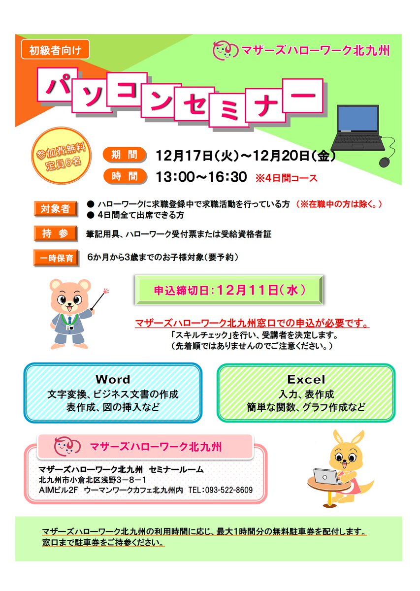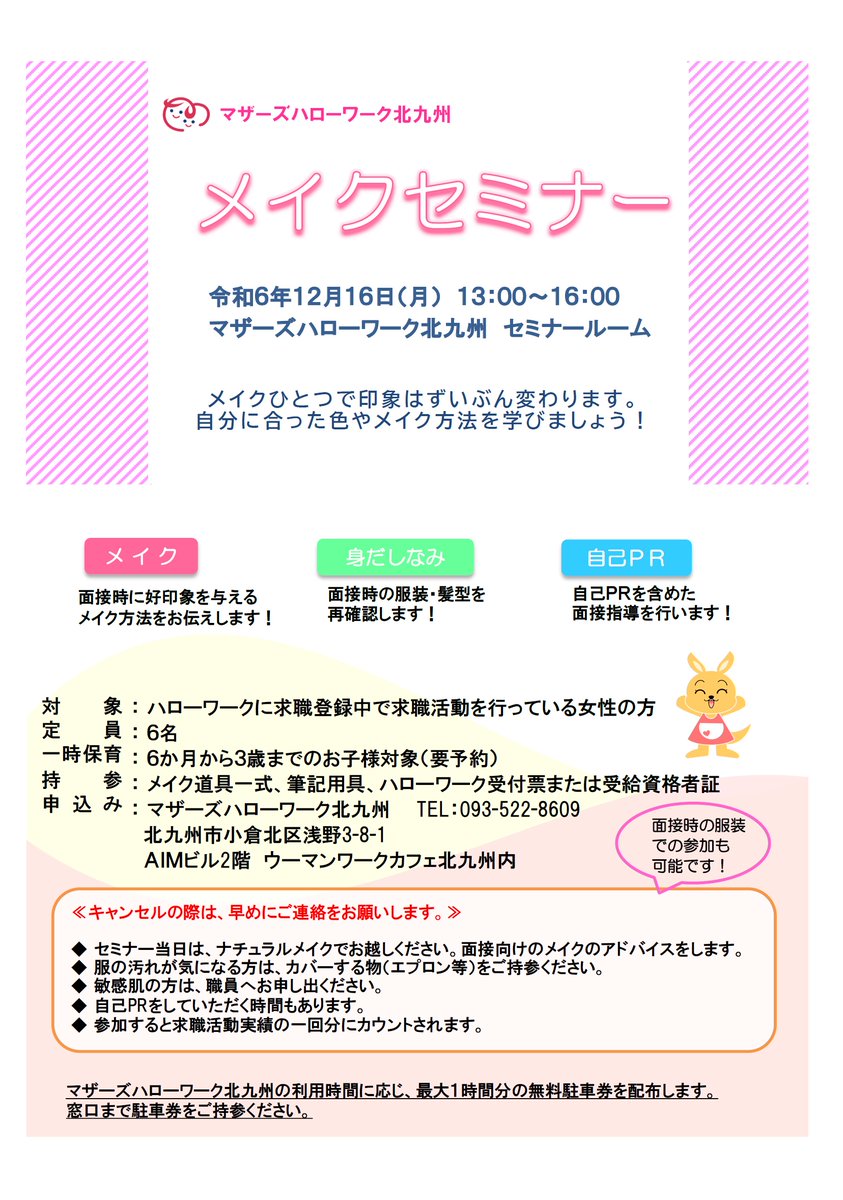 #セミナー情報『メイクセミナー』面接時に好印象を与えるメイク方法や、自己PRを含めた面接指導を行う実践的なセミナー大変人気のセミナーです(先着順)セミナーの詳細は、マザーズハローワーク北九州までお問い..