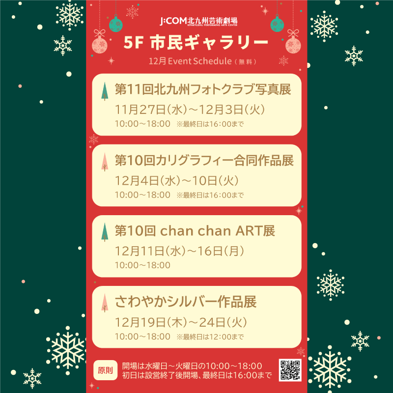 【市民ギャラリー12月スケジュール】リバーウォーク北九州5階入場無料内容はかるぽーをチェック!https://culpo-kitaq.jp/?page_id=1580北九州芸術劇場HPでも!https..