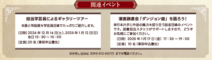 【11月30日開幕】#九井諒子展&「#ダンジョン飯」迷宮探索展関連イベントの参加受付中学芸員によるギャラリーツアー※12/14の回は残席わずか漫画読書会「ダンジョン飯」を語ろう!いずれもお電話(093..