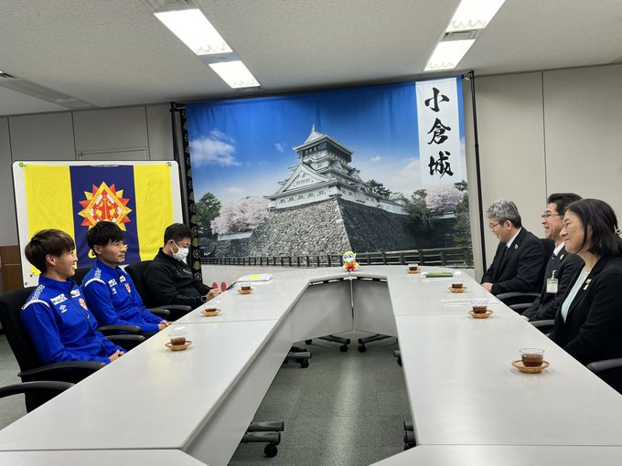 本日、ギラヴァンツ北九州小倉北区応援大使の#喜山康平選手と#小林里駆選手が天本小倉北区長を訪問されました!コロナ禍の無観客試合を経験している喜山選手は、サポーターの声援がモチベーションになっていること..