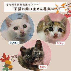 \譲渡対象の子猫の紹介/皆さま、こんにちは北九州市動物愛護センターです新たに譲渡対象になった子猫を紹介します生後2ヶ月、3種混合ワクチンとノミダニ駆除、お腹の虫下し済みです平日9:00~11:00、1..