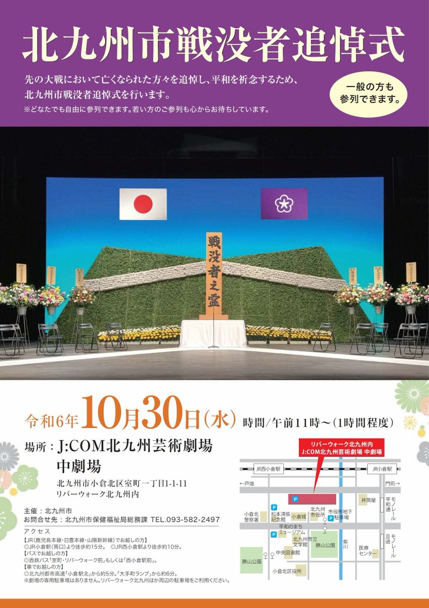 【北九州市戦没者追悼式】先の大戦で亡くなられた方々を追悼し、平和を祈念するため、戦没者追悼式を執り行います。10/30(水)11時~J:COM北九州芸術劇場中劇場どなたでも参加できます!若い方のご参列..