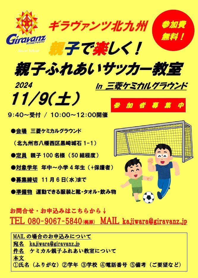 【参加者募集】///親子ふれあいサッカー教室in三菱ケミカルグラウンド\\\詳細はこちらhttps://giravanz.jp/school/13579/#ギラヴァンツ北九州