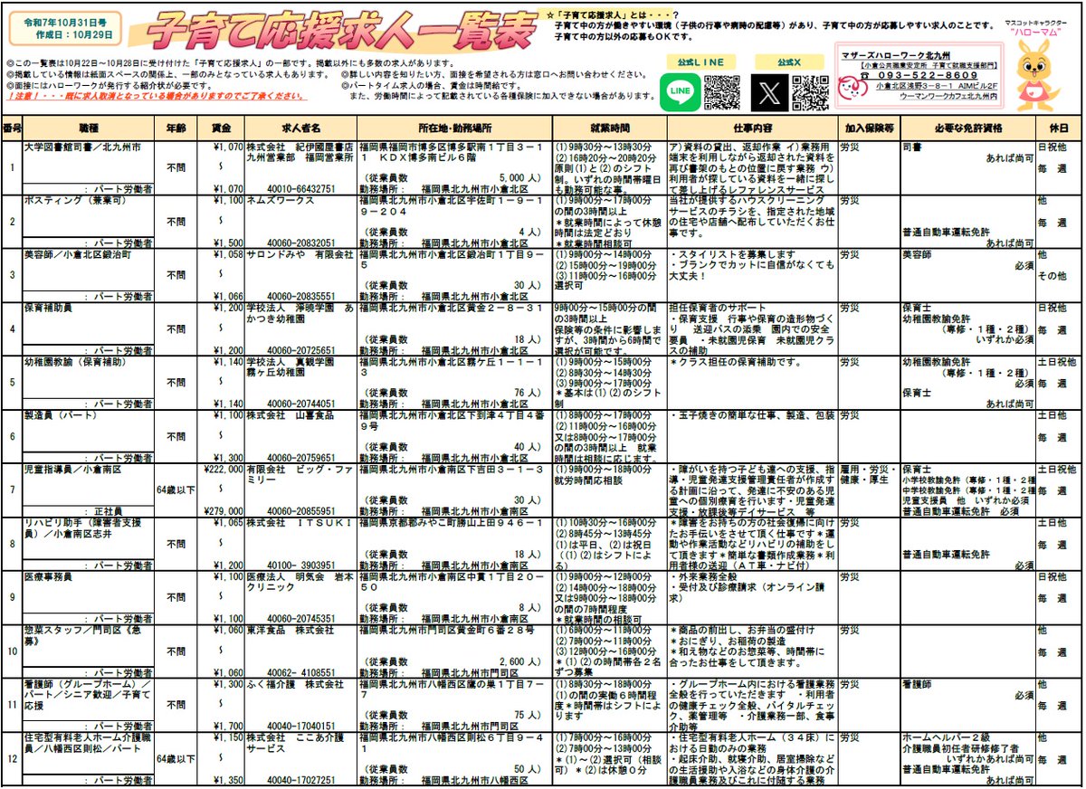 /週刊子育て応援求人(10月31日号)\この一覧表は、10月22日~10月28日に受け付けた求人の一部です求人内容の詳細はお気軽にお問い合わせください093-522-8609次回は11月7日(金)配信..