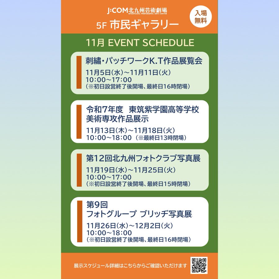 *◇━━━━━━━━━━━━━━━◇*J:COM北九州芸術劇場市民ギャラリー11月スケジュール*◇━━━━━━━━━━━━━━━◇*11月も市民ギャラリーでは多彩な作品展を開催中
