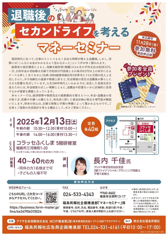 【PR】12月13日(土)福島市のコラッセふくしま5階研修室で「退職後のセカンドライフを考えるマネーセミナー」を開催します。