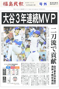 【電子号外】大谷3年連続MVP 二刀流で貢献 自己最多55本塁打 通算4度目選出 https://minpo.jp/epaper/ichiran ←こちらをクリック #福島 #fukushima #大谷翔平 #MVP